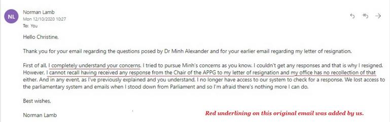 Sir Norman Lamb, the alleged recipient of the APPG Chair's response to his resignation, says he never received any response.