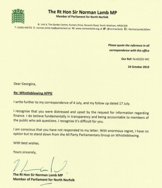 Please see Sir Norman Lamb's letter of resignation from the All-Party Parliamentary Group on Whistleblowing because the WBUK chief executive